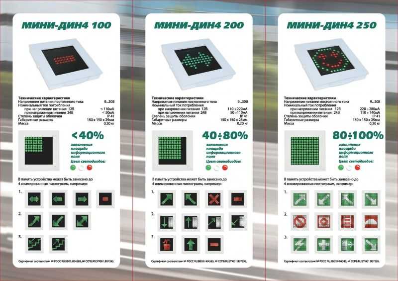 Для удобства расчетов стоимости светоуказатели МИНИ-ДИН4 разделены на следующие модификации: МИНИ-ДИН4 100, МИНИ-ДИН4 200 и МИНИ-ДИН4 250. Они отличаются площадью заполнения информационного поля, токопотреблением и стоимостью.